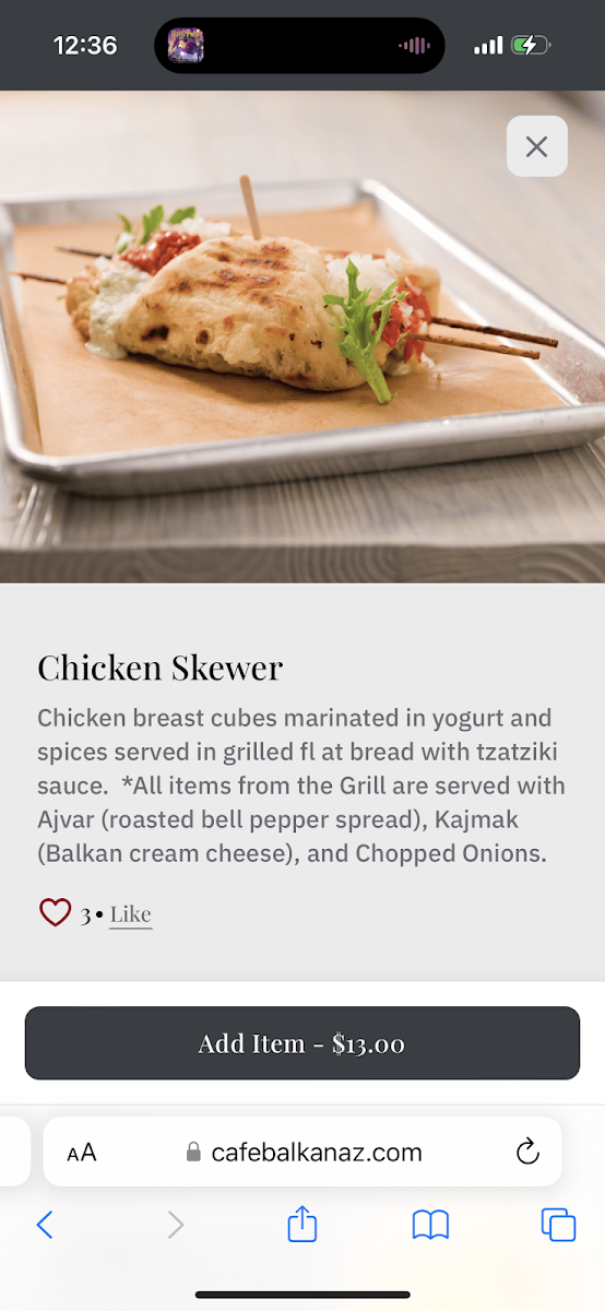 Chicken breast cubes marinated in yogurt and spices served in grilled flat bread with tzatziki sauce.